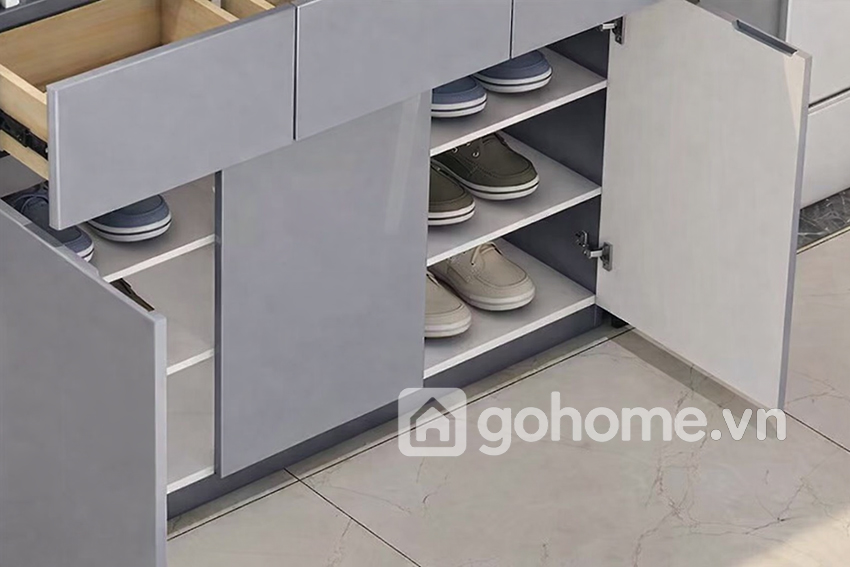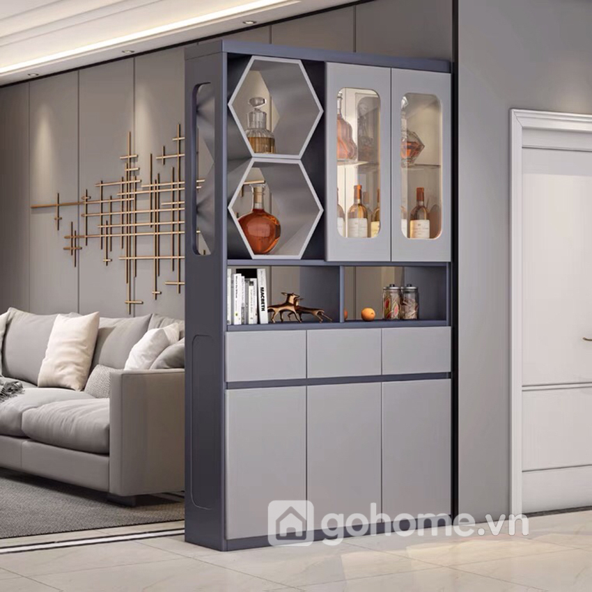Tông màu xám ghi phối đen nhám luôn được ưa chuộng trong nội thất hiện đại bởi tính trung tính, dễ phối hợp với sofa, bàn trà, sàn gỗ hoặc gạch men. Bề mặt phủ Melamine chống trầy xước, dễ lau chùi và giữ màu lâu bền, giúp chiếc tủ rượu hiện đại phòng khách luôn như mới qua nhiều năm sử dụng