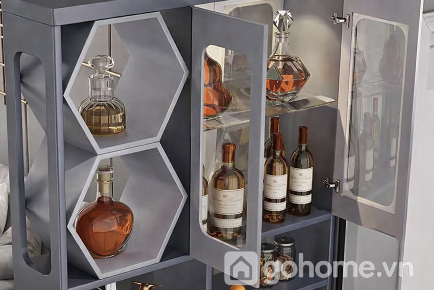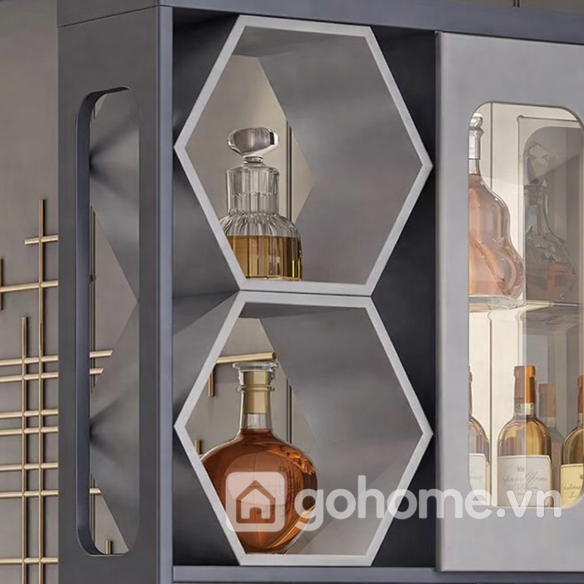 Hai hộc rượu lục giác chính là “vũ khí thẩm mỹ” tạo nên sự khác biệt cho mẫu tủ này. Không theo cấu trúc vuông vức truyền thống, các hình khối lục giác mang đến cảm giác hiện đại, phá cách nhưng không kém phần tinh tế. Đây cũng là chi tiết giúp ánh sáng từ đèn LED phản chiếu rượu vang trở nên lung linh, tạo chiều sâu cho không gian.