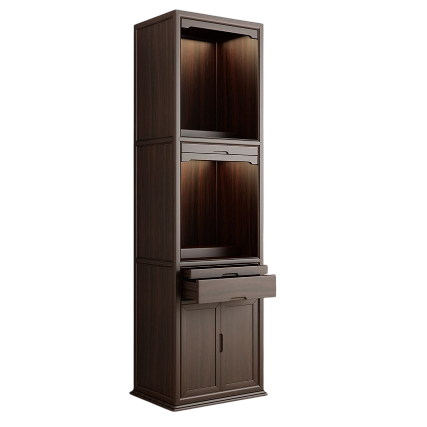 Chiếc tủ thờ 3 tầng bằng gỗ tự nhiên nổi bật với thiết kế dạng đứng cao, chia tầng rõ ràng, tạo nên bố cục chuẩn mực và khoa học cho không gian thờ cúng. Tông màu nâu trầm sang trọng kết hợp với vân gỗ tự nhiên tinh tế mang lại cảm giác ấm áp, trang nghiêm và đầy chiều sâu.