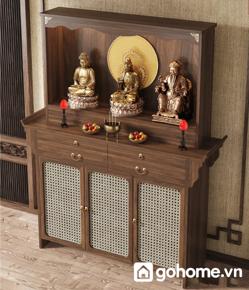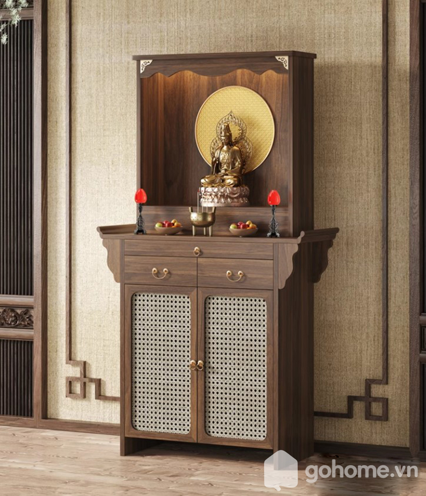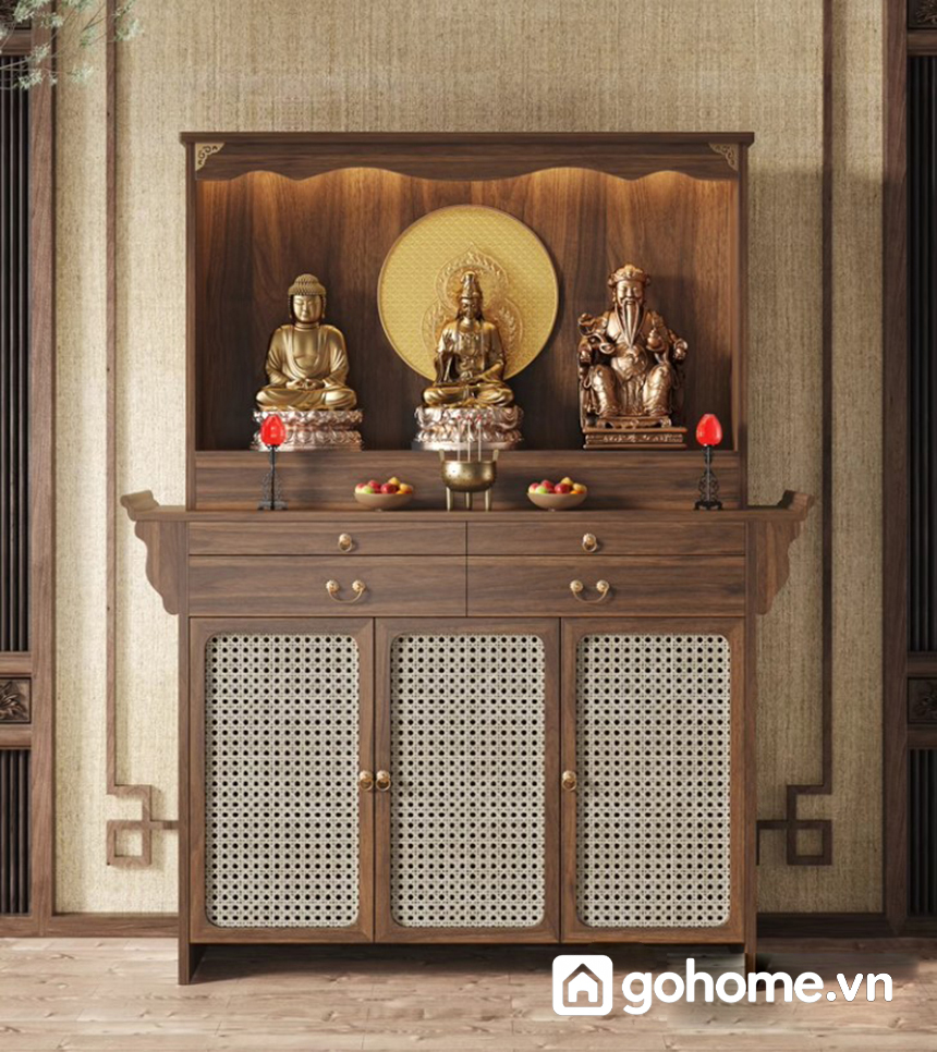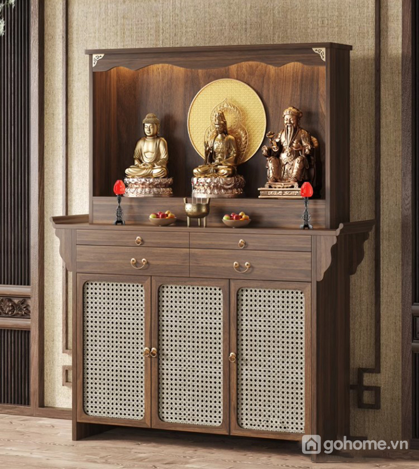 Không chỉ nâng cao tính thẩm mỹ, mà còn giúp lưu trữ đồ thờ tiện lợi mà không bí bách – đặc biệt phù hợp với khí hậu nóng ẩm.