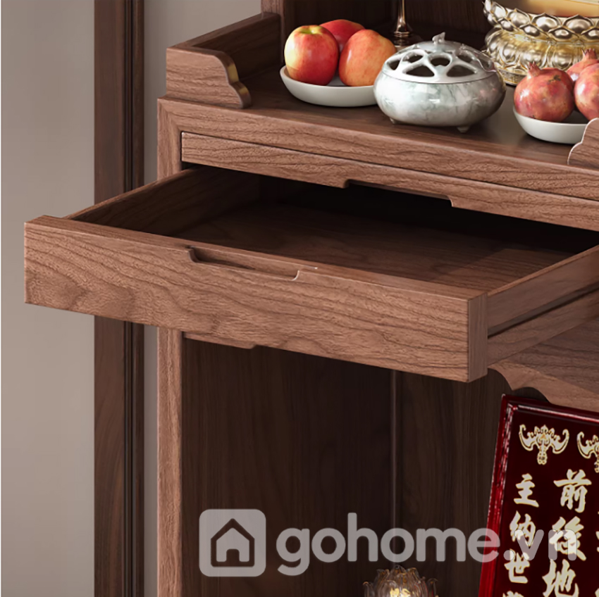 Với cấu trúc 3 tầng khoa học, sản phẩm không chỉ giúp phân chia không gian thờ cúng rõ ràng mà còn mang đến sự cân đối hài hòa, tạo điểm nhấn nổi bật trong phòng khách, phòng thờ riêng hay căn hộ chung cư cao cấp. Thiết kế này đặc biệt phù hợp với những gia đình yêu thích phong cách nội thất gỗ tự nhiên sang trọng, đề cao sự ấm cúng và bền vững theo thời gian.