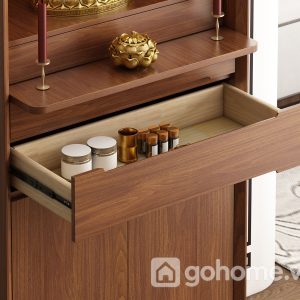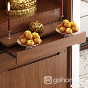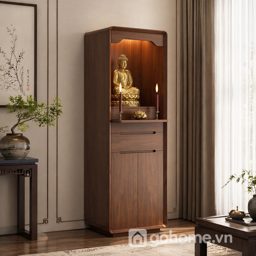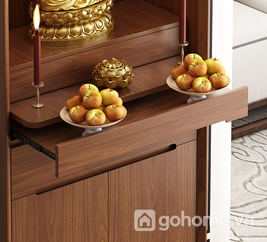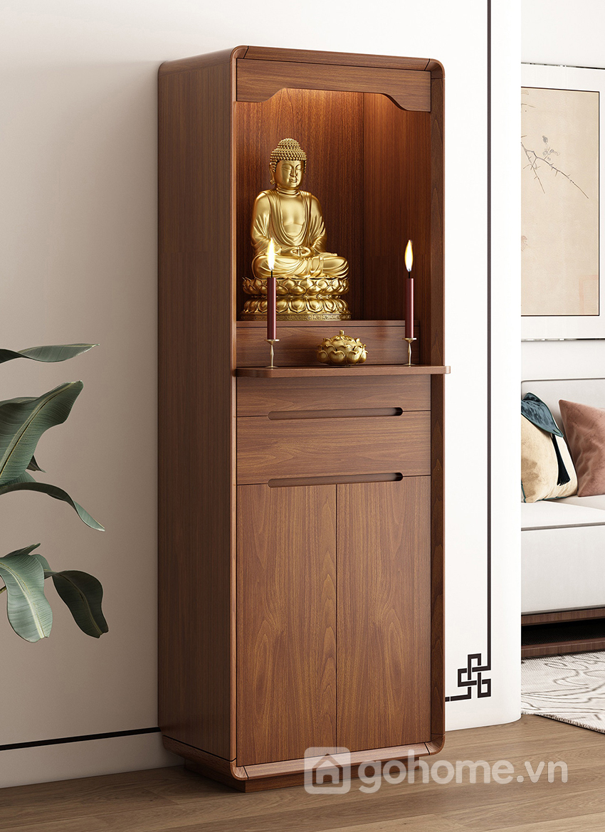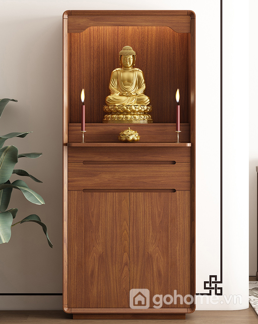 Phần bên dưới là ngăn kéo và tủ kín, giúp lưu trữ đồ thờ như nhang, đèn, vật dụng cúng lễ một cách gọn gàng, kín đáo. Đây là dòng tủ thờ gỗ tự nhiên cao cấp, tủ thờ hiện đại cho chung cư, tủ thờ nhỏ gọn sang trọng rất được ưa chuộng hiện nay.