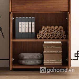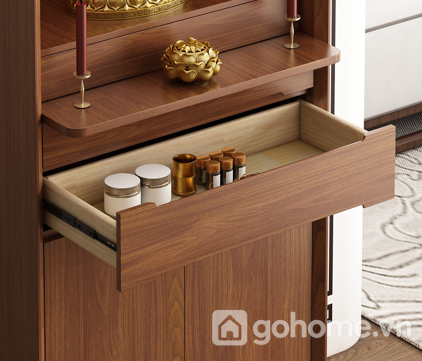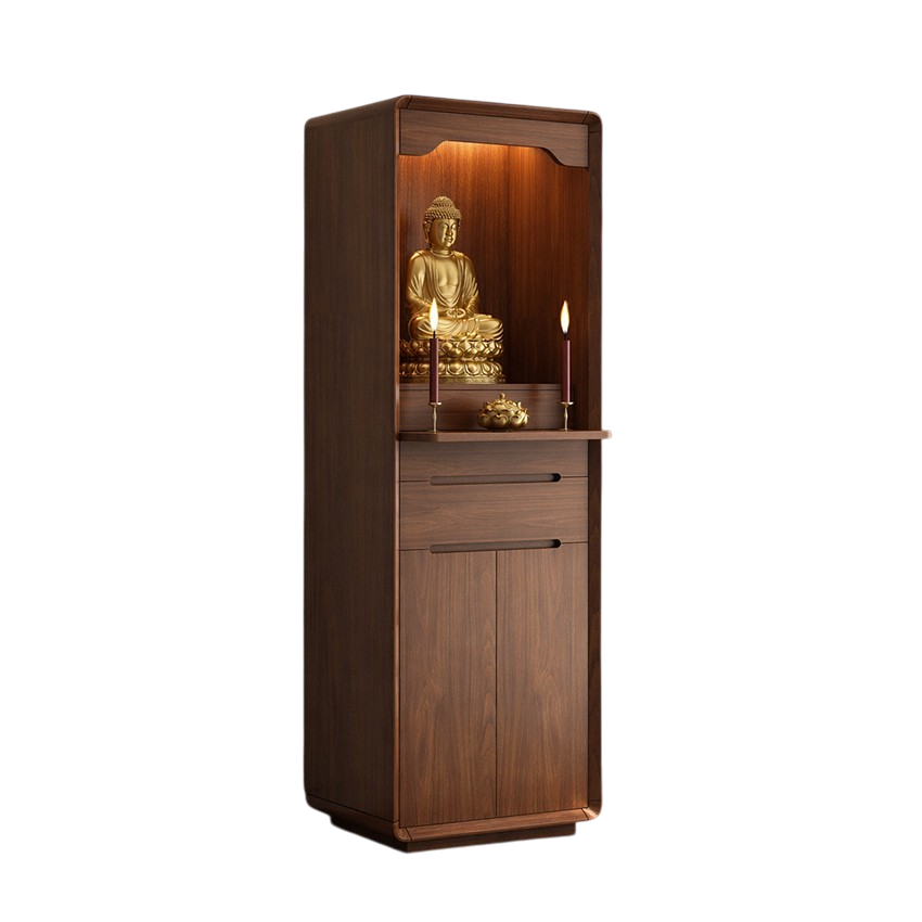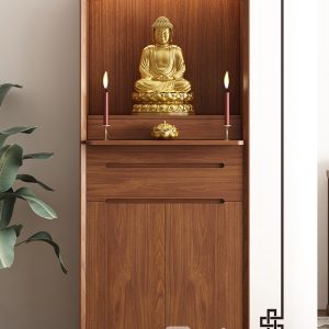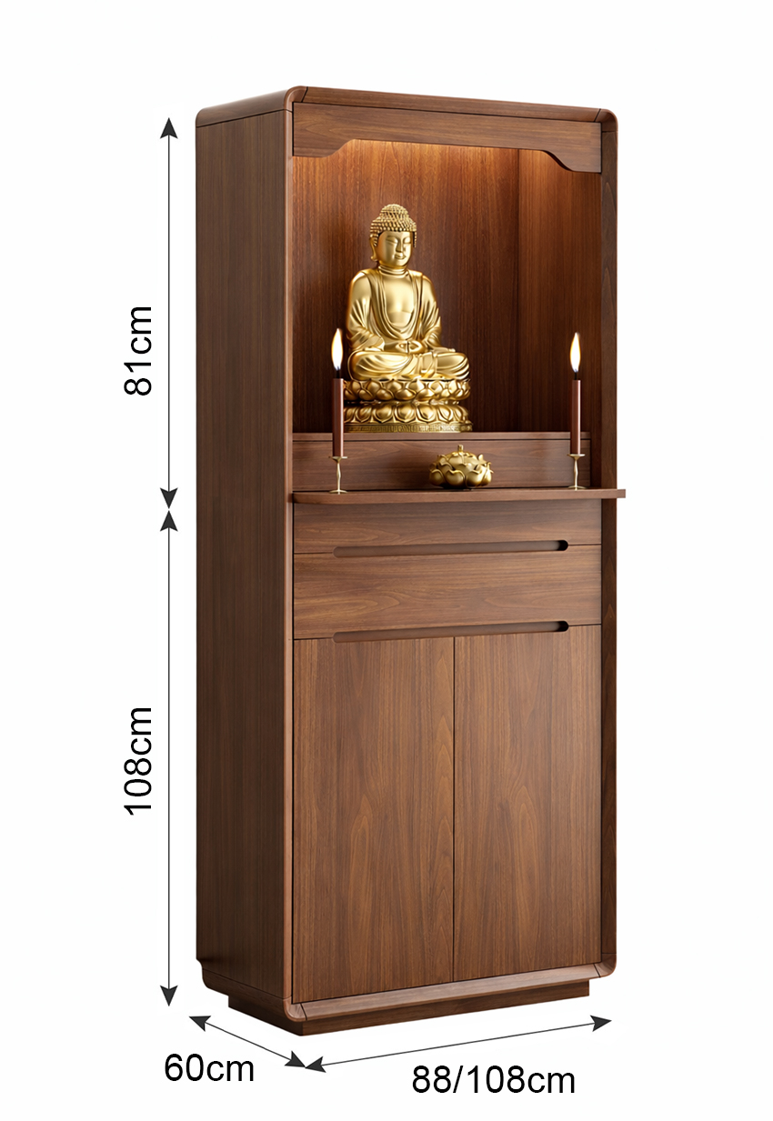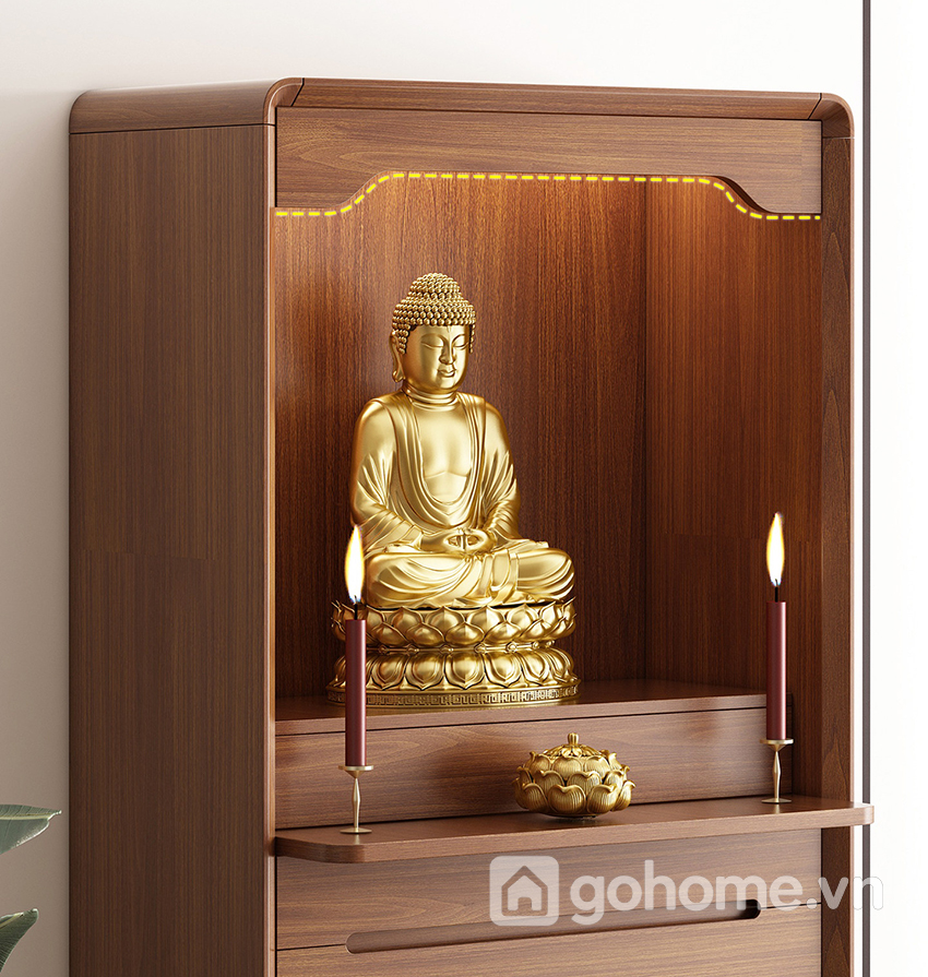 Phần bên dưới là ngăn kéo và tủ kín, giúp lưu trữ đồ thờ như nhang, đèn, vật dụng cúng lễ một cách gọn gàng, kín đáo. Đây là dòng tủ thờ gỗ tự nhiên cao cấp, tủ thờ hiện đại cho chung cư, tủ thờ nhỏ gọn sang trọng rất được ưa chuộng hiện nay.