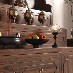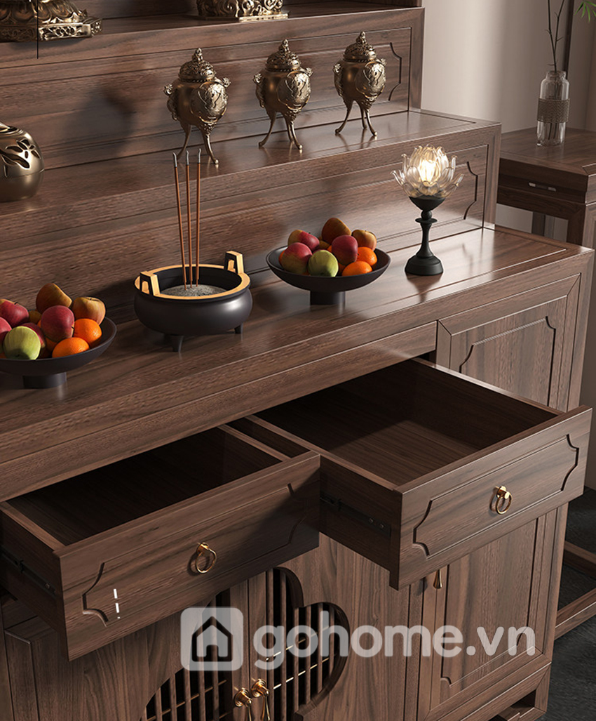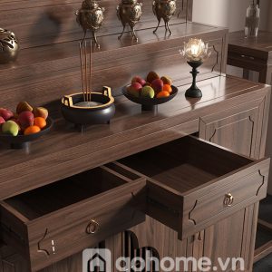 Ngăn tủ rộng rãi giúp lưu trữ nhang, nến, đồ lễ hoặc các vật dụng cần thiết trong quá trình thờ cúng. Thiết kế cánh tủ với họa tiết truyền thống tạo điểm nhấn tinh tế và giúp tổng thể sản phẩm trở nên sang trọng hơn.